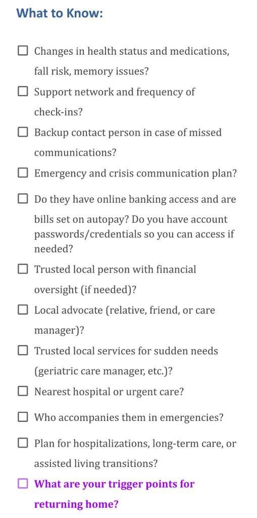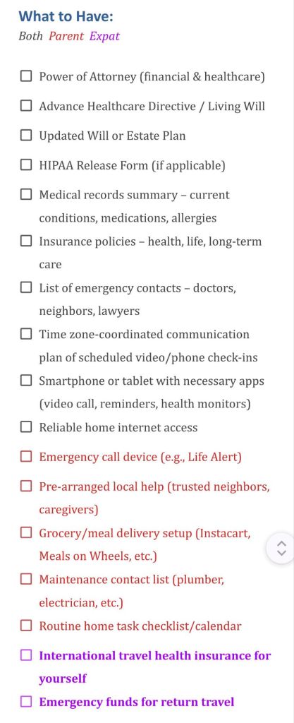 I hope the following list is helpful for anyone with elderly parents, whether you’re moving abroad or not. For expats, don’t underestimate the need to think through — in advance, before emotions are high — what scenarios will trigger a return home. This plan will guide you when events occur and the opinions of others are flowing freely. Let them opine or judge. Let that go. You are prepared for whatever this reimagined life of yours brings.