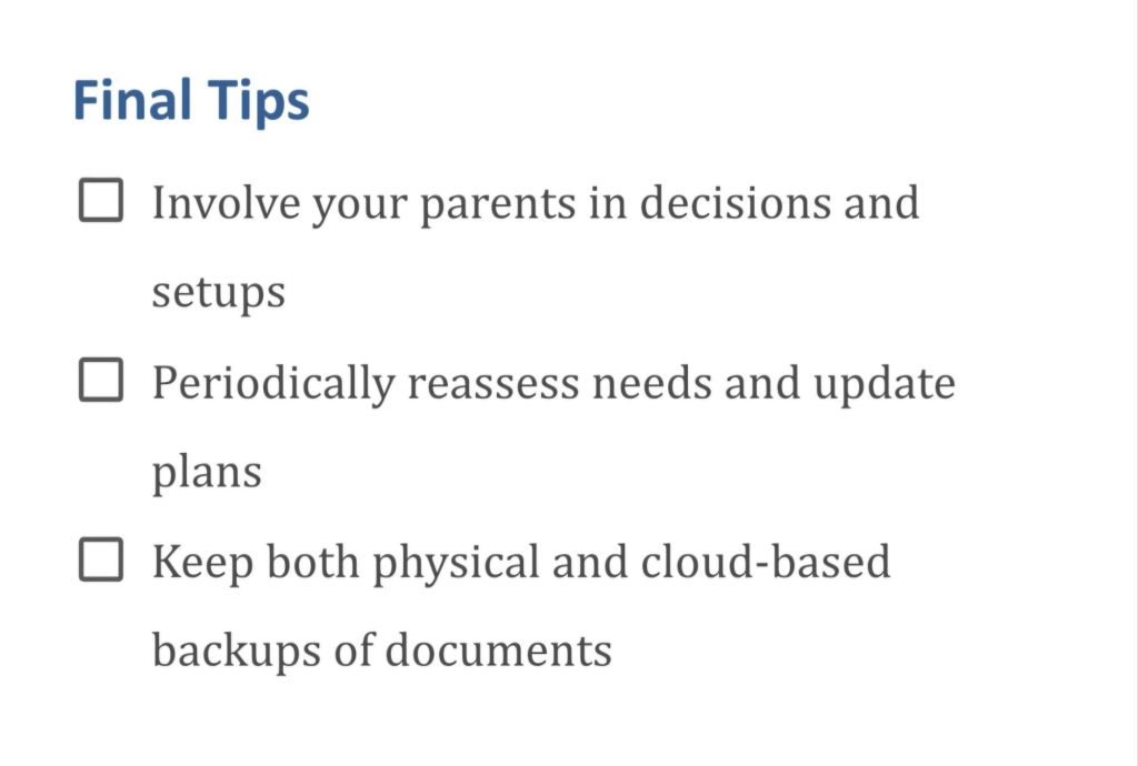 From a purely practical standpoint, it’s important to be well prepared if you choose to reimagine your life as a midlife expat leaving elderly parents behind. Emotional preparation is important and will be an ongoing process. Logistical preparation is critical and will help bolster emotional readiness and security. Start planning early, well in advance of moving overseas.