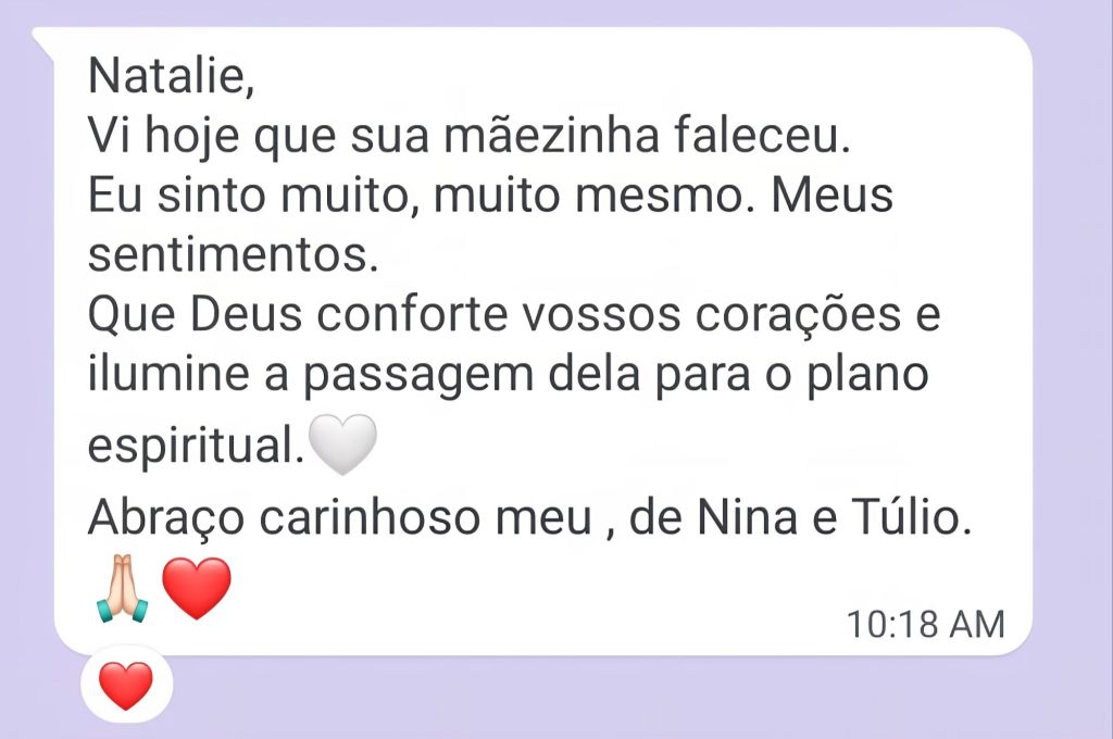 her passing to the spiritual plane. A warm hug from me, Nina, and Tulio.”