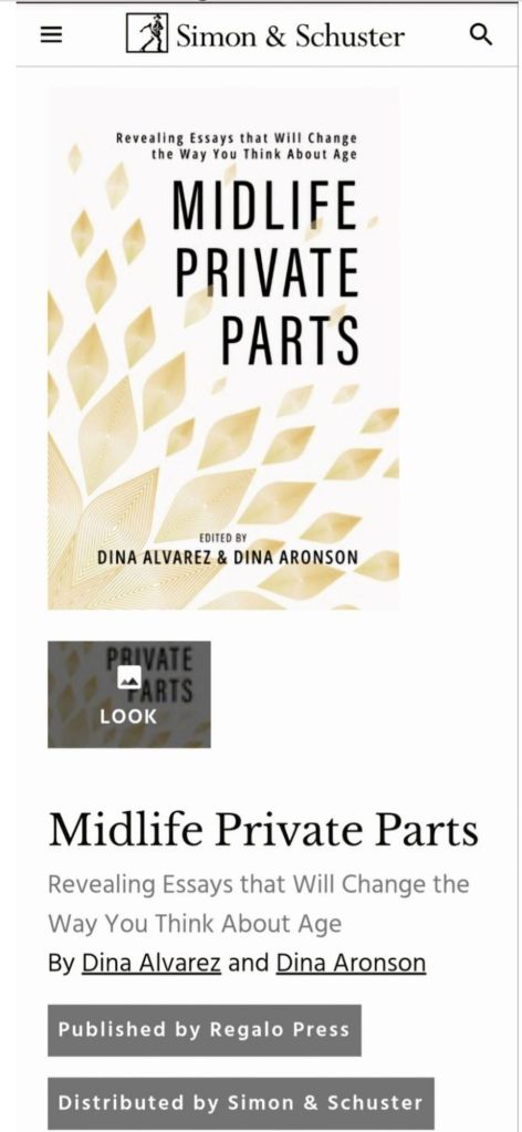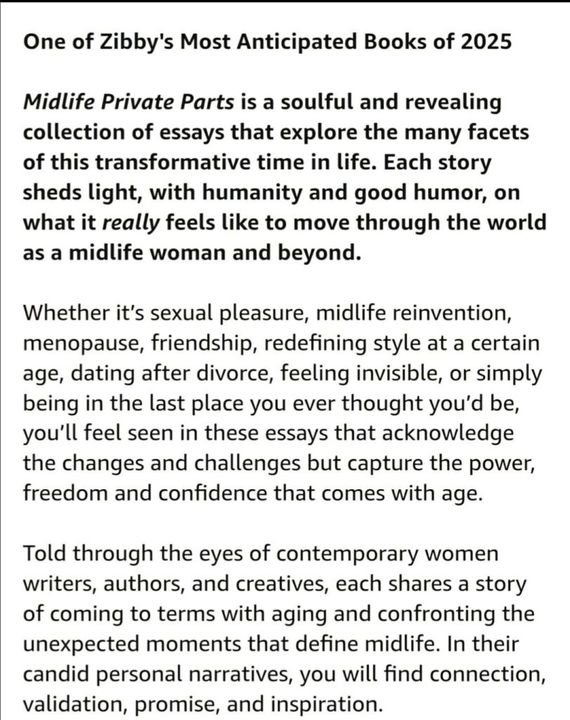 While on the subject of my private parts, I want to again thank Dina Alvarez and Dina Aronson for including me as a contributing writer in Midlife Private Parts, a collection of 28 essays by midlife women writers. A Zibby Most Anticipated Book of 2025, Midlife Private Parts is published by Regalo Press and distributed by Simon & Schuster. These essays will have you laughing and crying. And, yeah, there is mention of pussy.